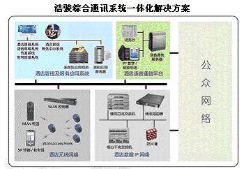 浩駿綜合通訊系統一體化解決方案集成了有線和無線網路,融合了語音、資料、視頻等多媒體服務,同時整合了管理和服務相關的專業應用系統,是爲現代業者量身定制的端到端的專業解決方案。在提供的這套解決方案中,在以新一代融合通信網路技術爲核心的基礎通信平臺上,精心爲業者定制了包括前臺管理系統、電話計費系統、資産管理系統、語音郵箱系統、傳真服務系統、資訊服務系統等全套的專業應用系統,通過所有這些應用系統和先進網路的有效整合, 可以爲的所有尊貴客戶和自己的所有員工提供包括有線、無線網路全覆蓋的,無與倫比、體貼入微的高品質資訊化服務。